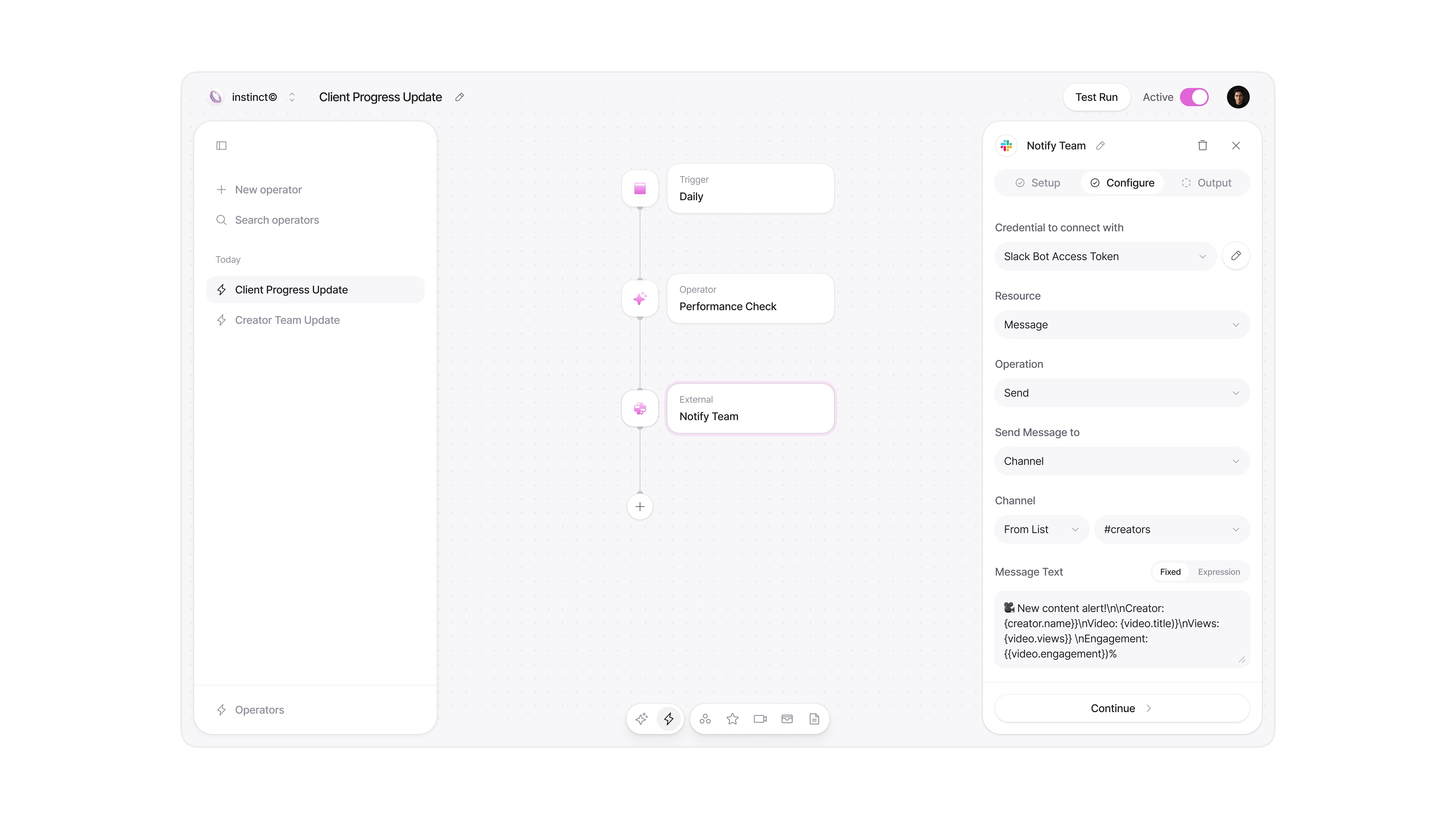 After these two sprints, the founders came back with a bigger ask. They had rethought the entire product experience, moving from a traditional dashboard to an AI-centric interface built around a chat experience and workflow automations they called "operators." They arrived with a rough, napkin-level concept of how it should work. We took that vision, structured it, and designed it from scratch: new components, new layouts, new interaction patterns, and around 30 additional screens with a rebuilt design system underneath. Throughout the retainer, we also coordinated directly with their development team, jumping on calls and answering questions to make the handoff as seamless as possible.